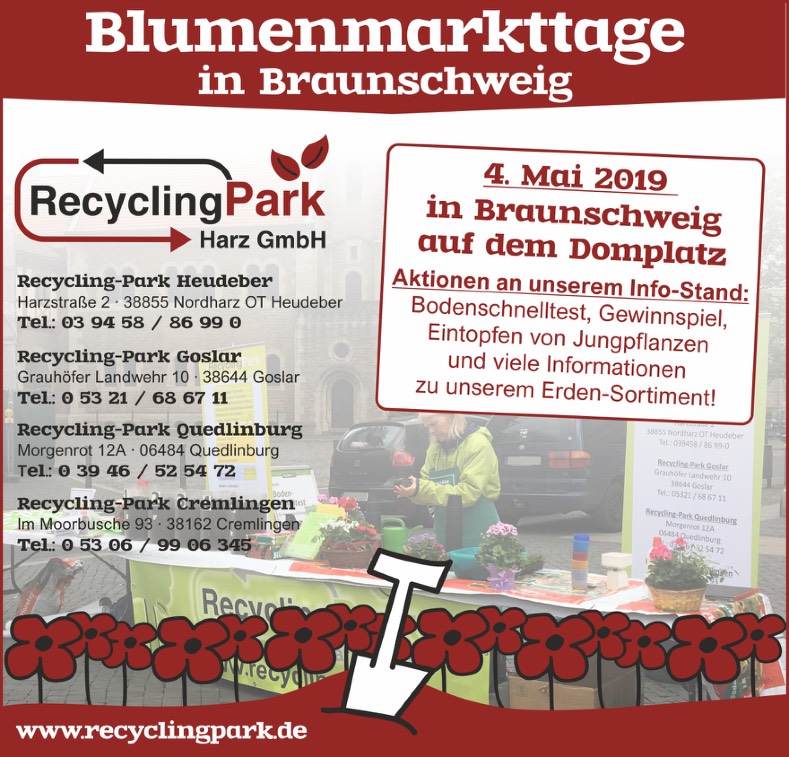 Am 04. Mai 2019 ist es wieder so weit. Wir laden zum Blumenmarkttag in Braunschweig ein. Im Sinne unserer Unternehmenskultur möchten wir der Natur etwas zurückgeben. Einmal jährlich organisiert der Recycling-Park in Zusammenarbeit seiner vier Standorte diesen Tag.